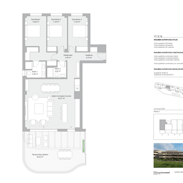 El dormitorio principal de 22 m² cuenta con baño en suite, zona de vestidor y un diseño pensado para el confort absoluto. Los otros dos dormitorios son de generosas dimensiones y comparten un baño completo de altas prestaciones.