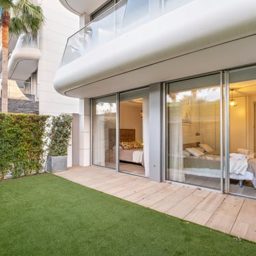 Apartamento de lujo en planta baja con jardín privado y vistas al mar en The Edge, Estepona