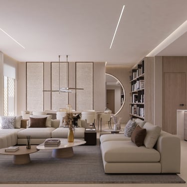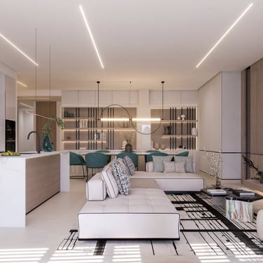 Amplio salón-comedor de 50 m² con cocina totalmente abierta y elegante isla central, ideal para disfrutar y recibir invitados.